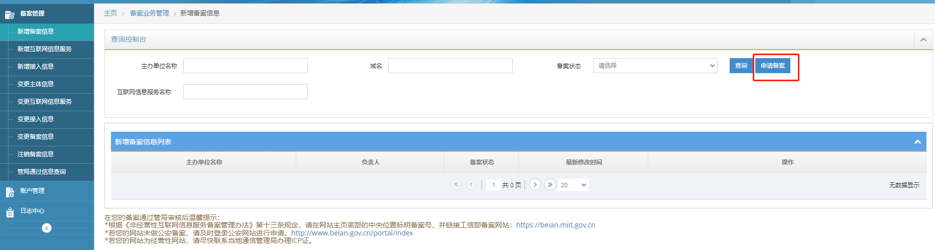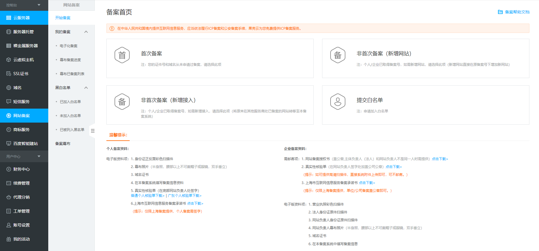 如您的主体(个人或企业)和域名之前都未备案过或者备案记录已经全部注销,请参照本文指引进行首次备案操作。 操作步骤