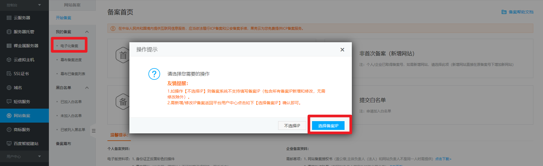 一、【电子化备案】 1、登录官网控制台,如已支持电子化备案,则点击电子化备案、选择备案IP 2、选择业务类型、业务IP,点击确认
